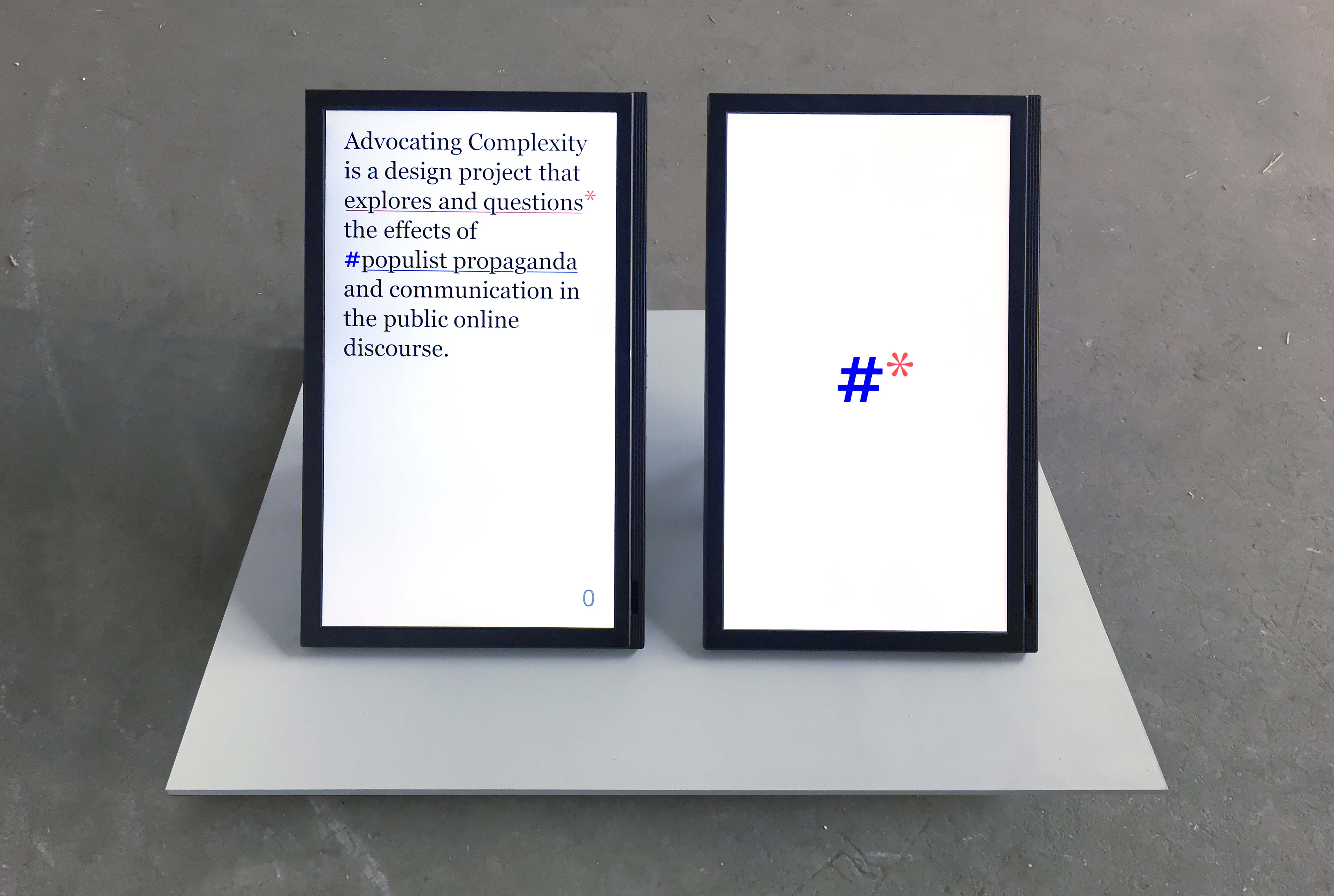Advocating Complexity is a bot that targets Twitter hashtags embodying extreme opinions on topics such as global warming, the refugee crisis and LGBT rights. Whenever the bot comes across hashtags like #sendthemhome, the bot asks questions such as: ‘Who are they?’ ‘How do you send them home?’ ‘Where is their home?’. Users are then sent to the online project platform, which aims to answer these questions by providing information based on reliable sources. With a relentless tide of populist propaganda within public digital discourse, this project advocates a more nuanced view on the complexities of contemporary social issues, often oversimplified by the use of hashtags.