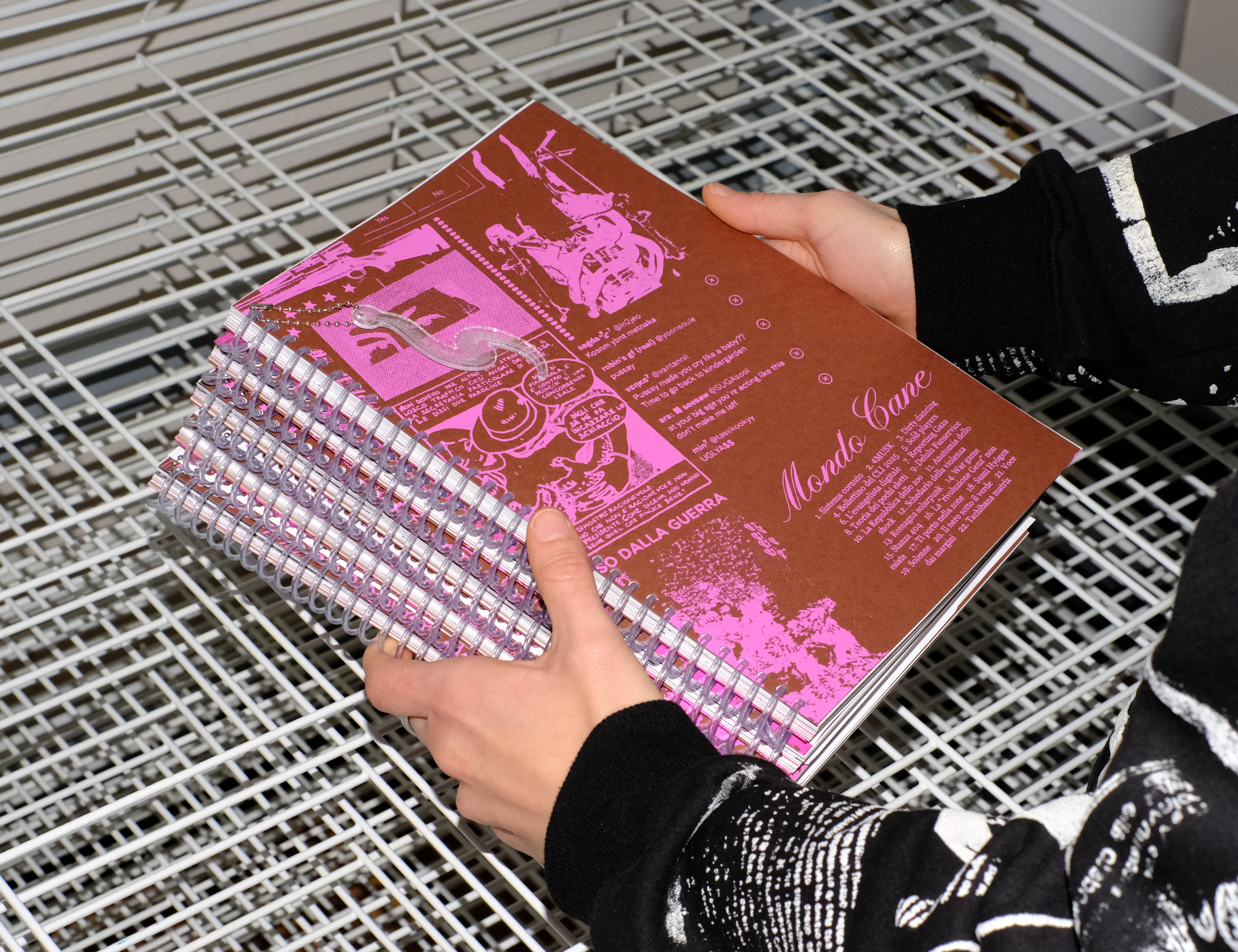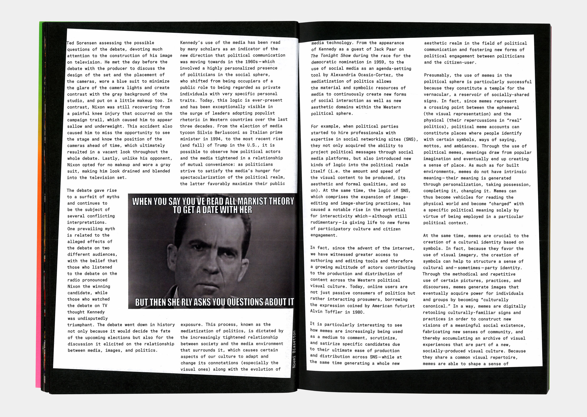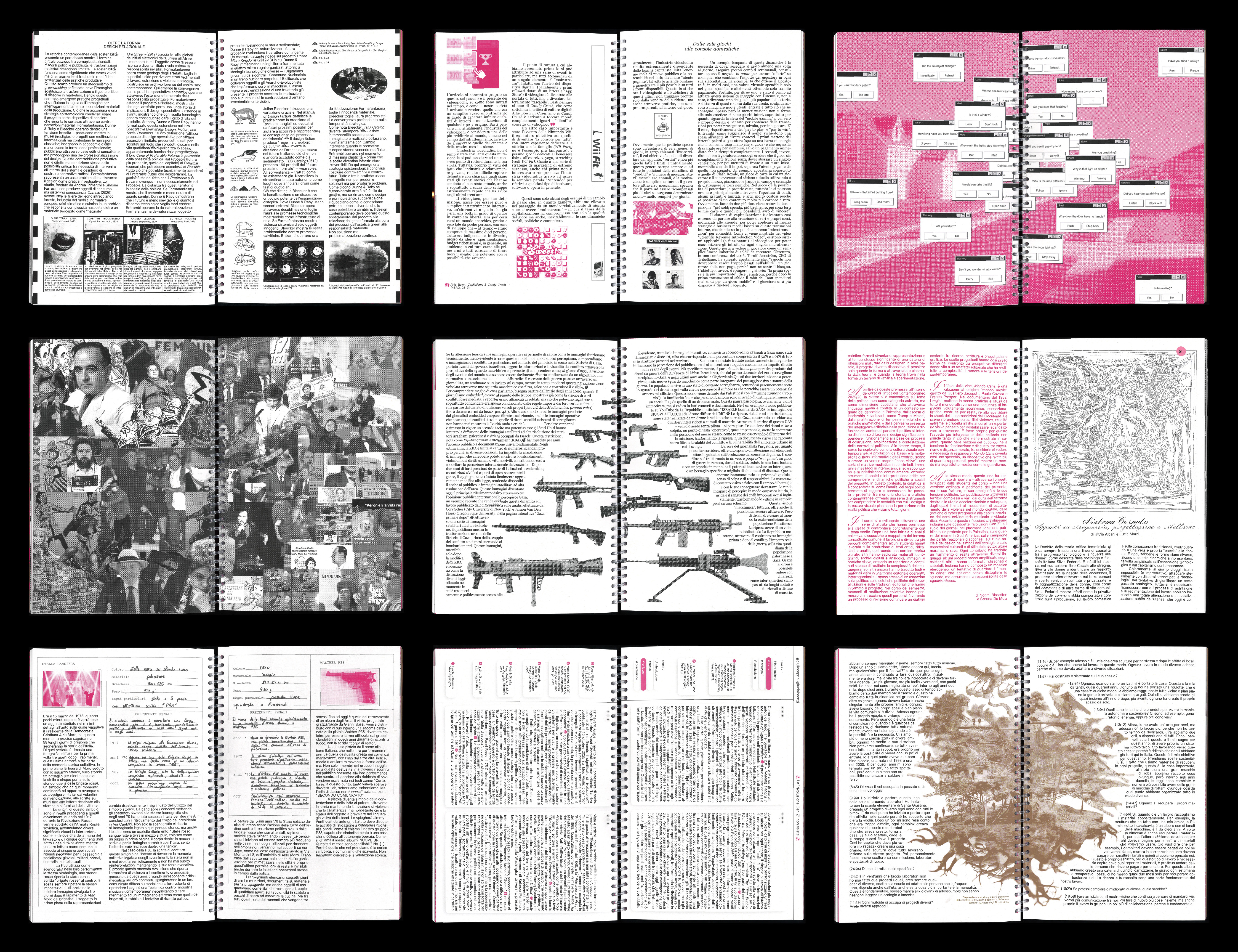 Mondo Cane is a collective zine produced in the Critical Theory course at UNIRSM Design, exploring the relationship between politics and design through articles, visual research, and graphic experimentation. Taking its name from the iconic 1962 Italian "mondo movie", the zine spans 114 pages of research into the eerie processes of our hypermediated world and how they shape our perception of politics. Over the semester, students operated as a newsroom, collaborating on both the editorial layout and all written and visual content. The projects range from analyses of far-right gurus and accelerationist and solarpunk utopias to investigations into the capitalisation of videogames, the backrooms phenomenon, cyberwitchcraft practices, the concealment of violence on social media, and much more.