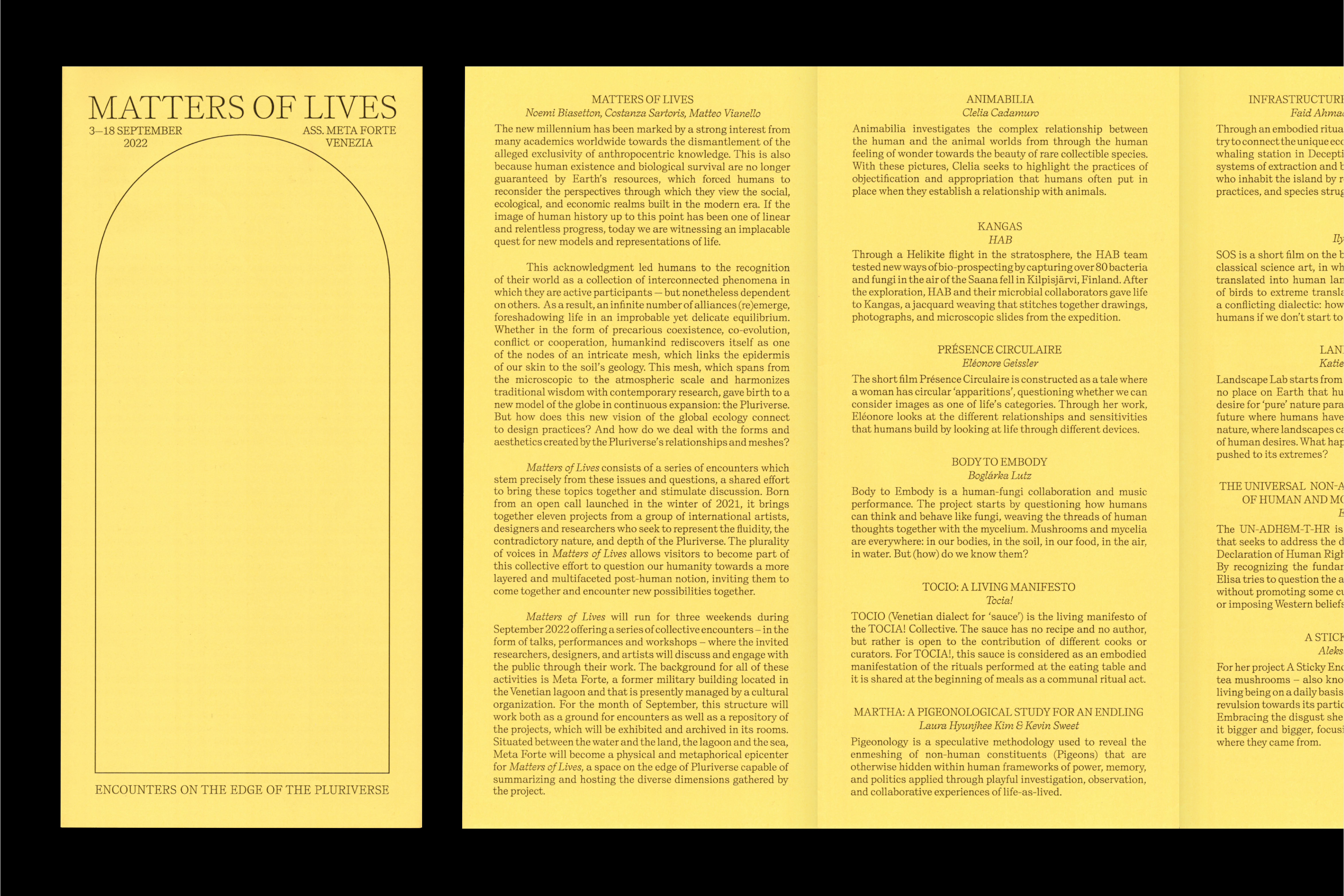 Matters of Lives | Encounters on the Edge of the Pluriverse consists of a series of gatherings which stem precisely from these issues and questions, and represents a shared effort to bring these topics together and stimulate discussion through embodied practices and shared knowledge. Born from an open call in late 2021, the project materialized during three weekends in September 2022, offering a series of collective encounters – in the form of talks, performances and workshops – where the invited researchers, designers, and artists discussed and engaged with the public through their work in the spaces of Meta Forte (Cavallino Treporti, Venice).