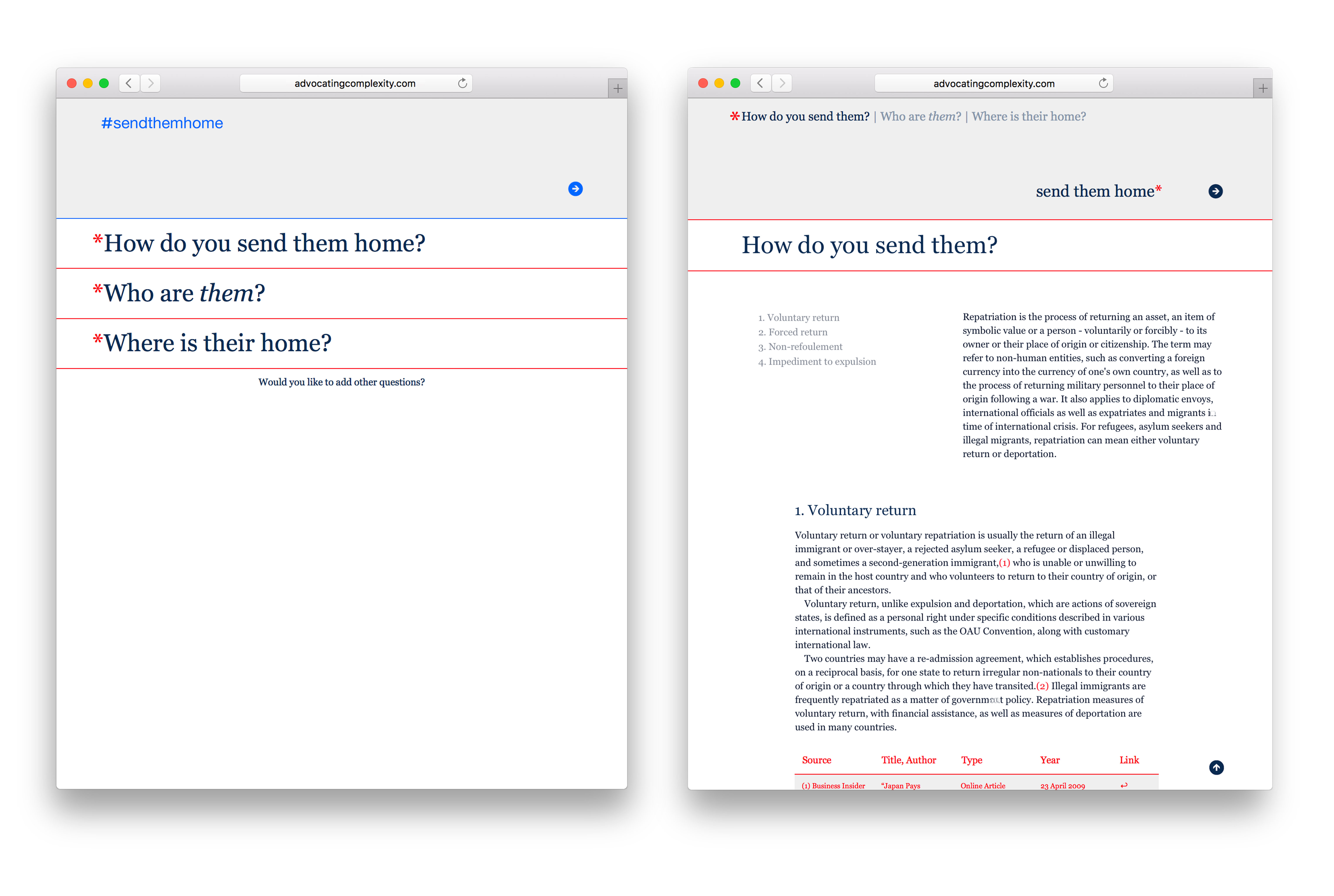 Advocating Complexity is a bot that targets Twitter hashtags embodying extreme opinions on topics such as global warming, the refugee crisis and LGBT rights. Whenever the bot comes across hashtags like #sendthemhome, the bot asks questions such as: ‘Who are they?’ ‘How do you send them home?’ ‘Where is their home?’. Users are then sent to the online project platform, which aims to answer these questions by providing information based on reliable sources. With a relentless tide of populist propaganda within public digital discourse, this project advocates a more nuanced view on the complexities of contemporary social issues, often oversimplified by the use of hashtags.