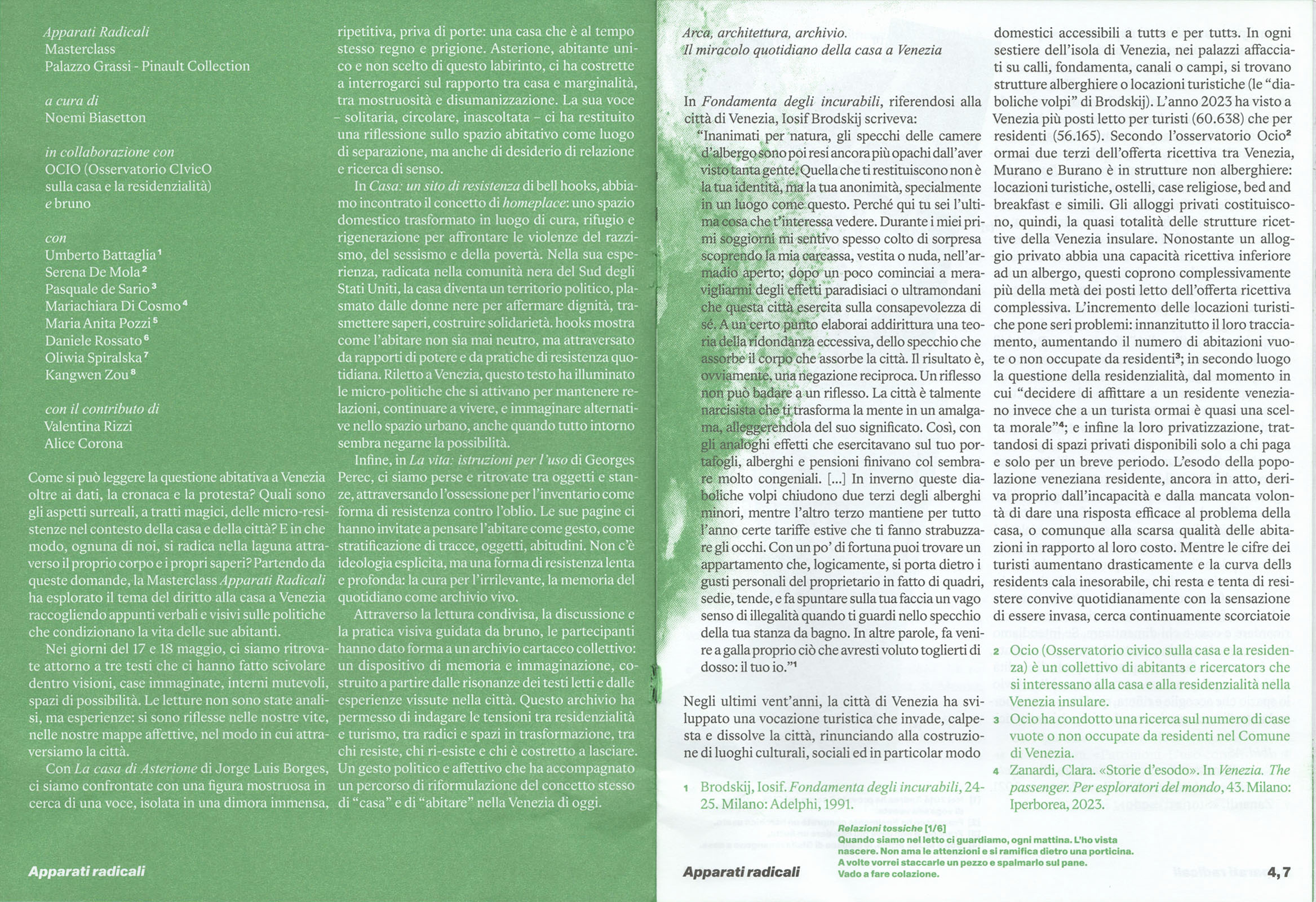La Masterclass Apparati Radicali è stata condotta dalla ricercatrice, autrice ed editor Noemi Biasetton, in collaborazione con OCIO (Osservatorio CIvicO sulla casa e la residenzialità) e bruno, studio di grafica. In occasione della restituzione dei risultati della Masterclass, il Teatrino di Palazzo Grassi ha ospitato, lunedì 16 giugno, un incontro aperto al pubblico con Noemi Biasetton e Dafne Boggeri, artista multidisciplinare.
