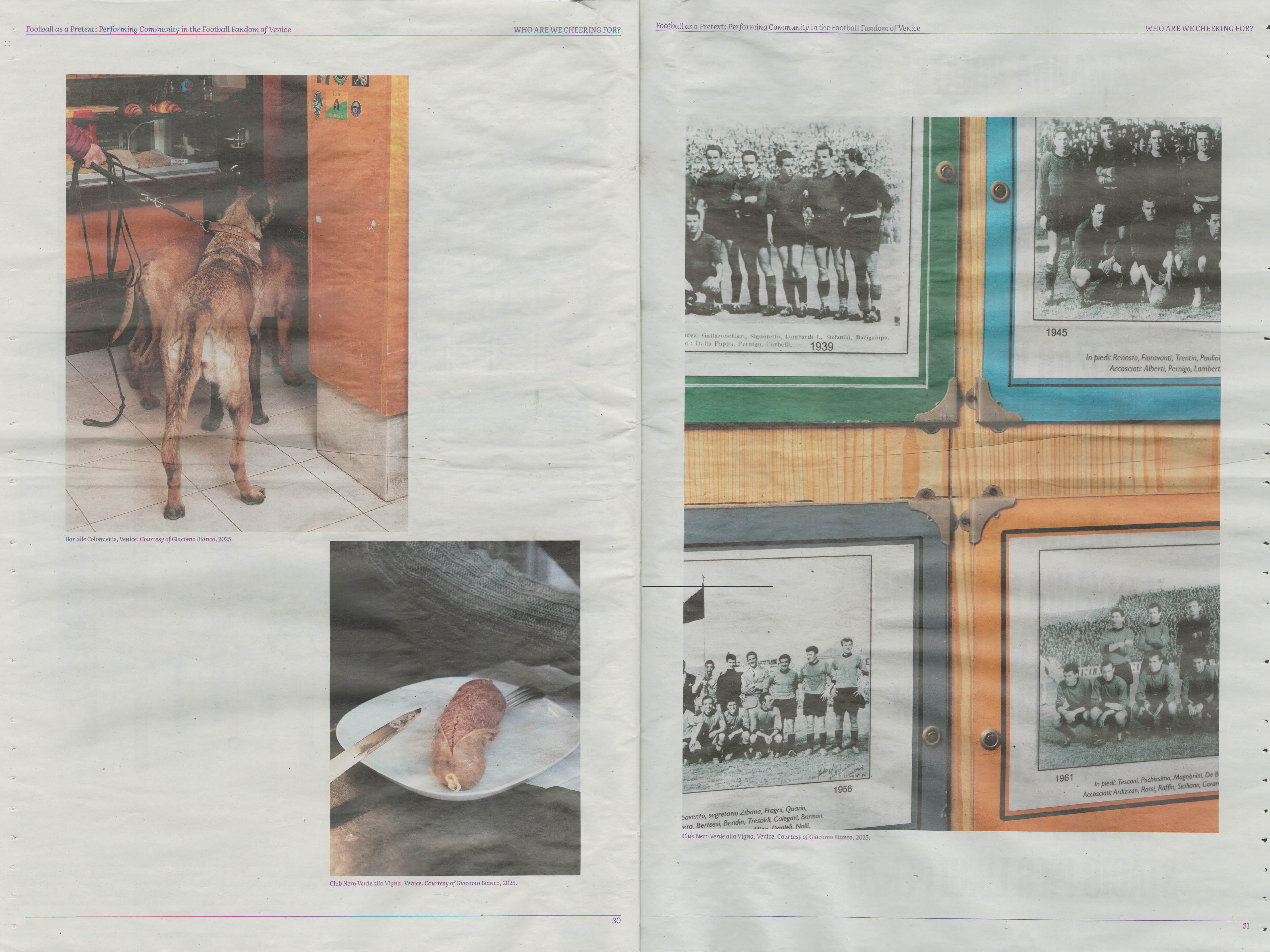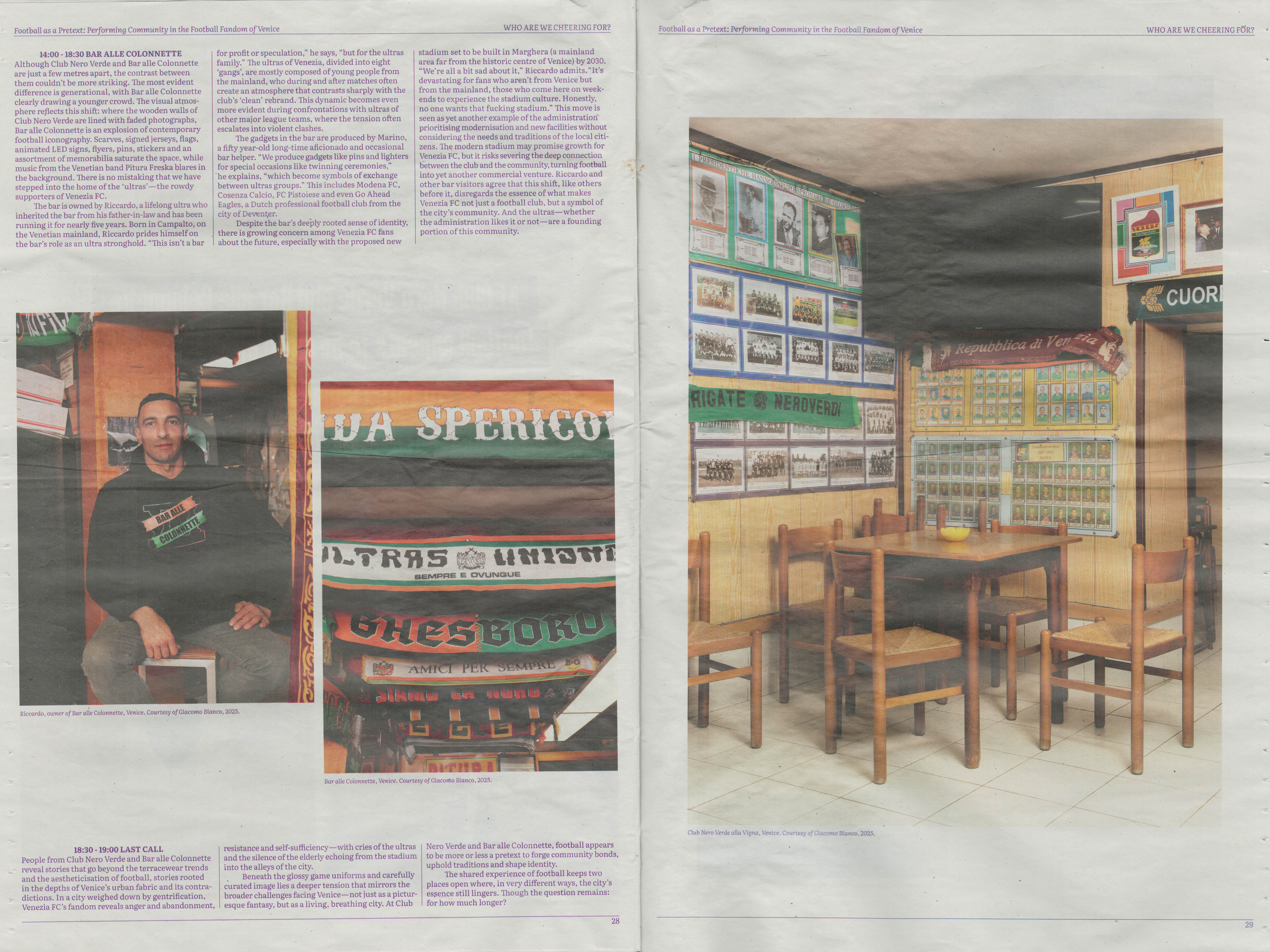 The article Football as a Pretext: Performing Community in the Football Fandom of Venice explores the role of football clubs in Venice and their acts of community-making through interviews and photographs, questioning how these spaces and their inhabitants respond to the increasing spectacularization of the city and its football club.