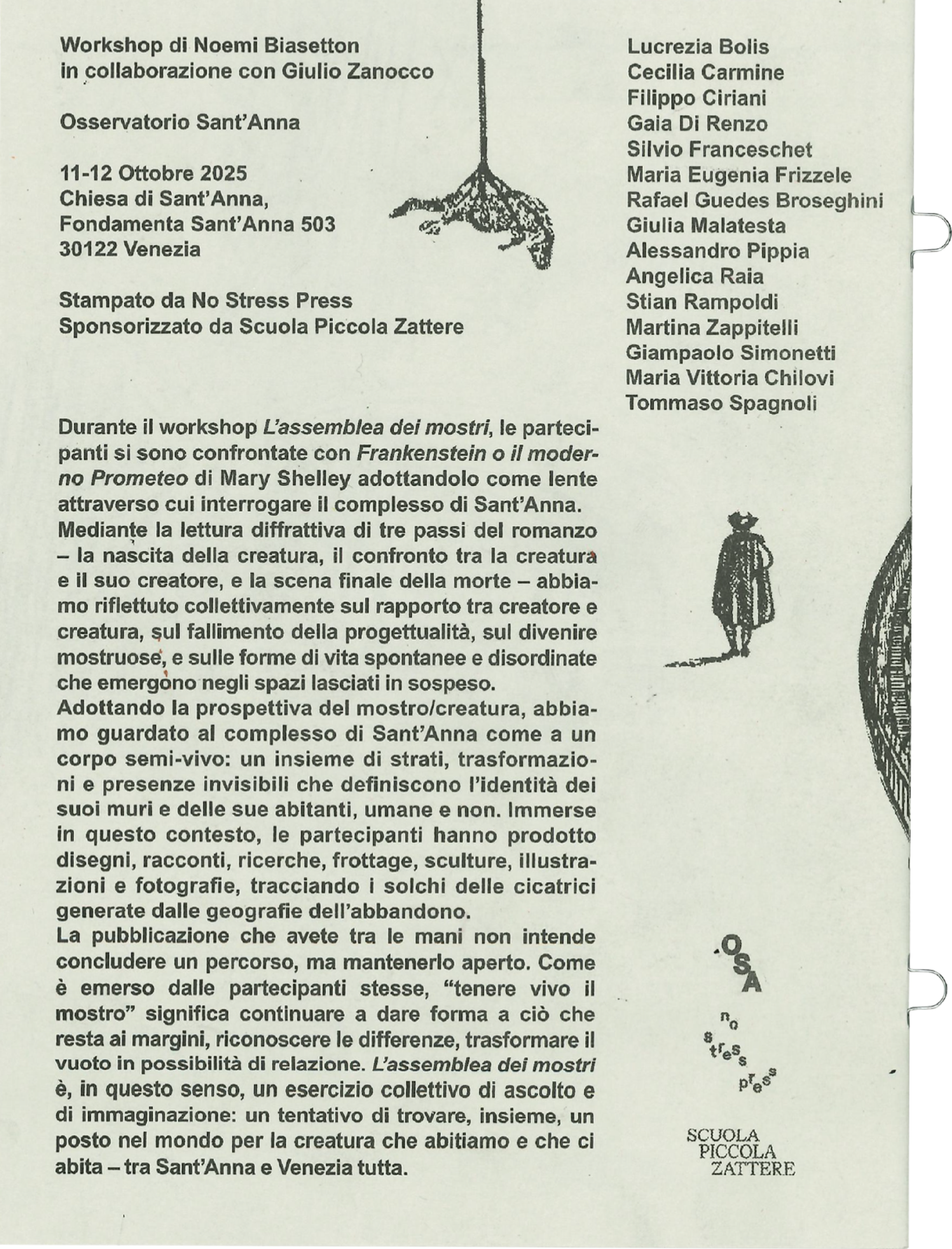 La pubblicazione non intende concludere un percorso, ma mantenerlo aperto. Come è emerso dalle partecipanti stesse, “tenere vivo il mostro” significa continuare a dare forma a ciò che resta ai margini, riconoscere le differenze, trasformare il vuoto in possibilità di relazione. L’assemblea dei mostri è, in questo senso, un esercizio collettivo di ascolto e di immaginazione: un tentativo di trovare, insieme, un posto nel mondo per la creatura che abitiamo e che ci abita – tra Sant’Anna e Venezia tutta.