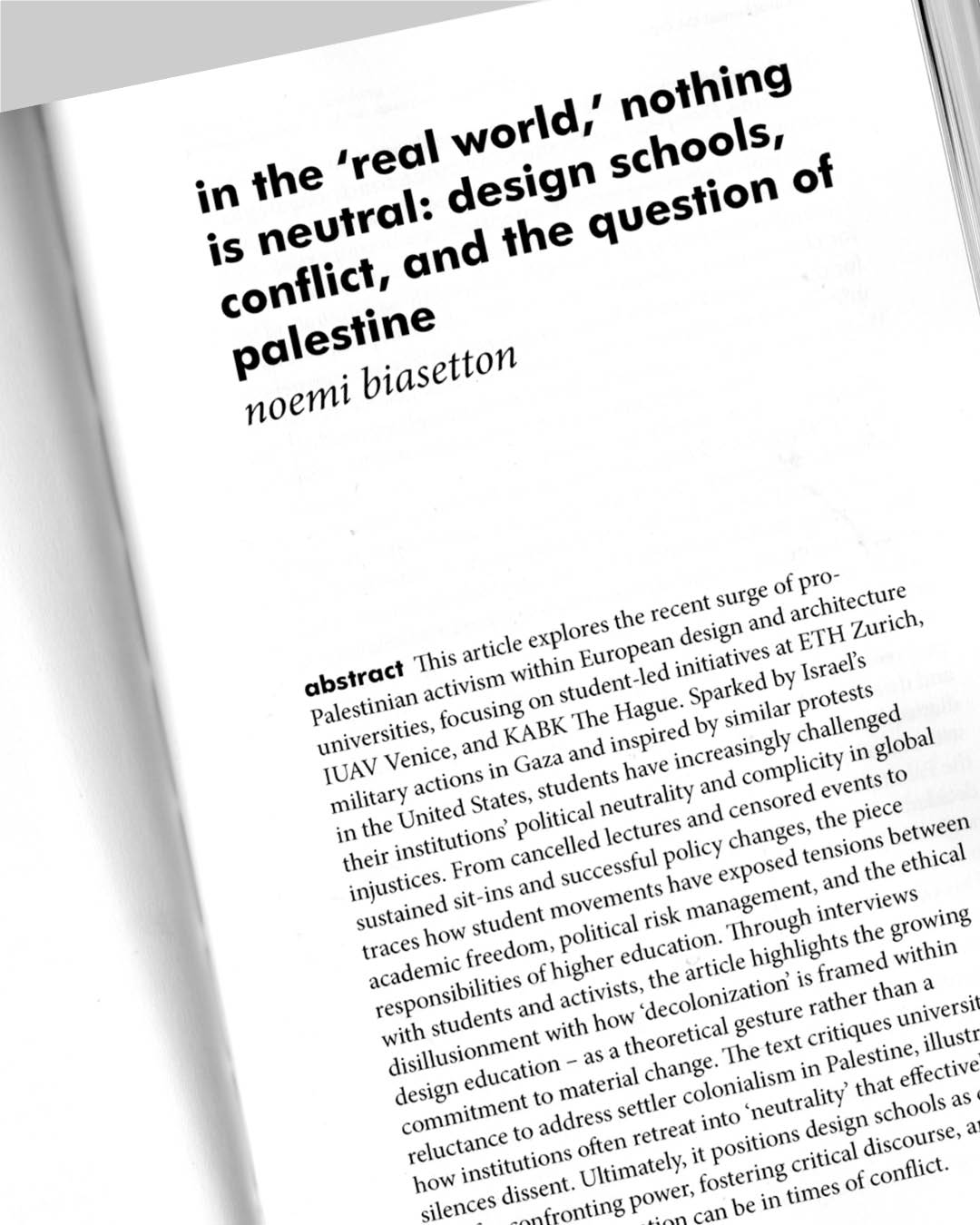The article explores the recent surge of pro-Palestinian activism within European design and architecture universities, focusing on student-led initiatives at ETH Zurich, IUAV Venice, and KABK The Hague. Sparked by Israel's military actions in Gaza and inspired by similar protests in the United States, students have increasingly challenged their institutions political neutrality and complicity in global injustices. From cancelled lectures and censored events to sustained sit-ins and successful policy changes, the piece traces how student movements have exposed tensions between academic freedom, political risk management, and the ethical responsibilities of higher education. Through interviews with students and activists, the article highlights the growing disillusionment with how 'decolonization' is framed within design education - as a theoretical gesture rather than a commitment to material change. The text critiques universities' reluctance to address settler colonialism in Palestine, illustrating how institutions often retreat into neutrality that effectively silences dissent. Ultimately, it positions design schools as crucial sites for confronting power, fostering critical discourse, and reimagining what education can be in times of conflict.